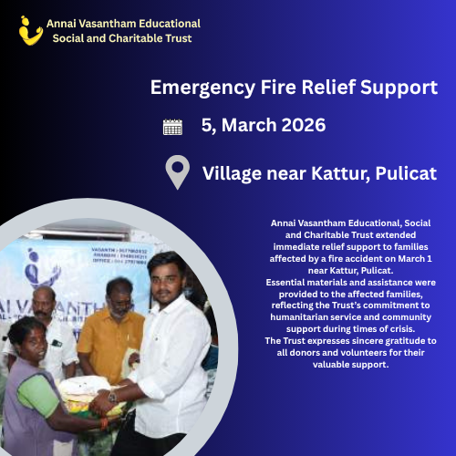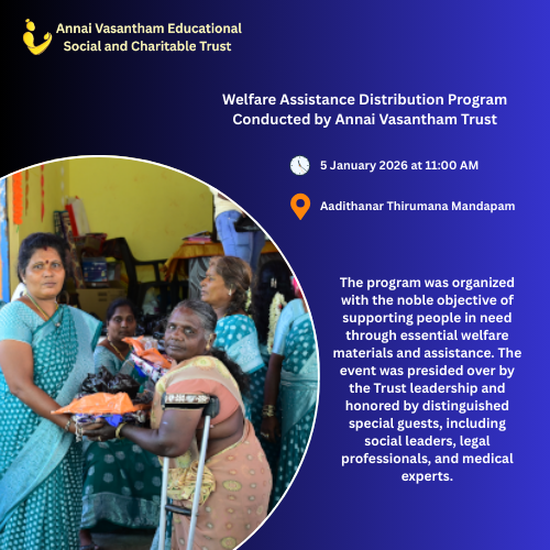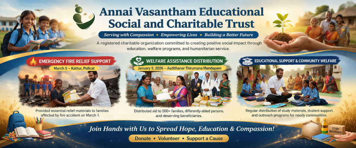 Annai Vasantham Educational Social and Charitable Trust is a registered charitable organization dedicated to creating meaningful social impact through education, welfare initiatives, and humanitarian service. Established with a vision of compassionate community development, the Trust works to uplift economically disadvantaged students, families in need, and vulnerable sections of society.